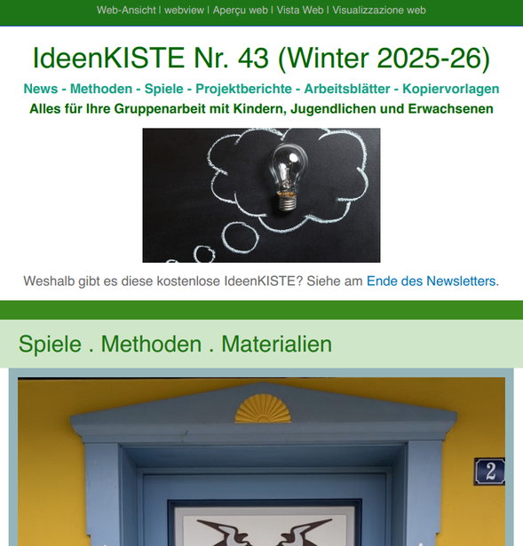 Unser Online-Magazin für Beratung und Gruppenarbeit, die IdeenKISTE Nr. 43 (Winter 2025) ist erschienen! Kostenlose Spiele, Materialien und News für alle Fachkräfte in der Sozialen Arbeeit, Kulturpädagogik und therapeutischen Praxis.